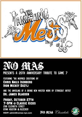 Tomorrow, Friday October 27th will be the 20th anniversary of the Mets' Game seven victory in the 1986 Series. In honor of this momentous occasion, we will be having a small gathering at Classic Kicks on Elizabeth Street between Houston and Bleecker. We invite you to join us from seven to nine PM.