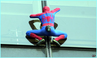 Crazy's name is Alain Robert, and he French. People call him Spider Man, for fairly obvious reasons. He climbs buildings all over the world using nothing but his innate climbing ability and his raging desire to climb stuff. He frequently gets arrested for these exploits, although I don't know why. It's hard to imagine anyone bothering to come up with a law against building-climbing.