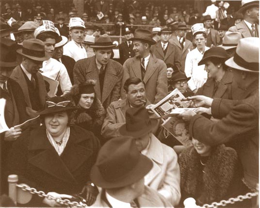 We start on October, 6, 1936, when the Yanks polished off the Giants 13-5 to win the World Series in six. The Bombers were led by their superstar rookie, Joe DiMaggio, who went 3 for 6 on the day and notched a run and an RBI, and left-fielder Jake Powell, who was 3 for 5 with 4 RBI’s. Lefty Gomez got the win. (The picture above is Babe Ruth at the '36 Series with none other than Kate Smith - the Babe had retired from baseball the year before.)