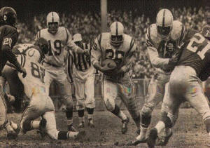 The game also features prominently in Frederick Exley's epic tale of personal dissolution, A Fan's Notes, a memoir/novel that, although it is far more than a football book, still may be the best football book ever written. The narrator is obsessed with Frank Gifford, and identifies his own fortunes with the Giants' star to the point of insanity.Of course, this particular game devastates Exley's drunken hero, as two Gifford fumbles figure prominently in the outcome, allowing the Colts to score their two first-half touchdowns.