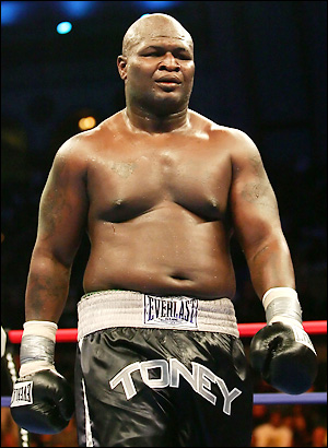 Why why why is James Toney so fucking fat? It really pisses me off. Here we are in one of the darkest eras of heavyweights in recent memories, with a bunch of over-the-hill ex-Soviet meatslabs holding the belts, dudes who Ali wouldn't have deigned to SPAR with... and here's Toney, a legitimate brawler with more skills and ring savvy than the whole lot of them combined, and yet he's simply too fat and out of shape to compete at the highest level. I'm sure you saw the Rahman fight - the only thing keeping James from turning the lights out on Hasim was his lack of consistent output. He landed at will, but then he always retreated. He's carrying like an extra dude of fat on him - a brutha that fat throws a flurry or two, brutha needs a breather. Ain't no way to knock out a 230-pound man.I'm particularly annoyed about this today after reading Dan Rafael's account of Toney's profanity-laced harangue in a conference call yesterday to promote his September 2nd bout with the Nigerian Nightmare, Sam Peter (don't miss this fight, by the way - somebody WILL get knocked out). Toney has real personality - he's hilarious, he's sullen, he's weird. This could have been his era. No one ever would have confused him for a top-teir heavyweight champ, but he might have been remembered as one of those guys who held the belts with ferocity and style until another true talent emerged. Instead, he's buried in the pack with the rest of the palookas, all because of... well, let's face it. Because of Twinkies and Ring Dings and Whoppers with cheese.