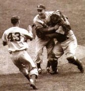 On this day in 1955, years of frustration and second-class citizenship came to an end for Brooklyn baseball fans, as the Brookyln Dodgers won their first and only World Series, defeating the Yankees 2-0 in a game 7 nailbiter.Gil Hodges knocked in both the Dodger runs, Roy Campanella in the fourth and Pee Wee Reese in the sixth (here's the boxscore of the game.) Meanwhile, Johnny Podres blanked the mighty Yankees with a complete-game shutout. It was Podres second complete game victory in the series, earning him the MVP award in the first year a World Series MVP was named.