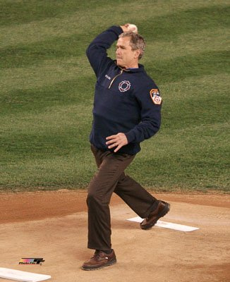 Five years ago tonight, President George Bush threw out the first pitch of Game 3 of the World Series at Yankee Stadium. Only seven weeks after the September 11th attacks, it was clearly meant as some kind of a defiant act, the sort of meaningless macho bravado that has since become W's calling card ("Mission accomplished..."). I do remember that he threw a strike from the regulation pitching rubber. THAT was defiant. Any terrorists watching that shit must have had second thoughts about winning a game 7 with W on the mound. Osama was like, "if Bush starts against us we're going to have to be patient at the plate and make him waste pitches, get to their bullpen..." And look, say what you will about the 2000 election, but you know Al Gore would have rolled that thing up to Posada.