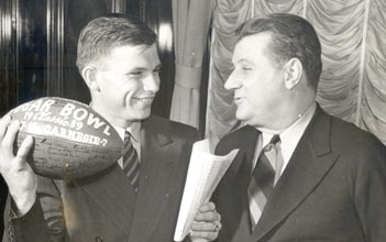 Bert Bell died on this day 47 years ago – October 11, 1959. That's him up there on the right with Davey O'Brien, his first-round pick for the Eagles in 1939. Bell is a big name in the PA sports universe, having once been sole owner of the Eagles and part owner, with Art Rooney, of the Steelers. He also presided over the merger of the two teams in 1943, when because of the war they were forced to join forces and play as the “Pennsylvania Steagles,” a dark dark time that both Eagles and Steelers fans have collectively decided to pretend never happened.