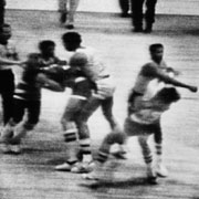 To take nothing away from the severity of this tragedy and the havoc it wrought in both of these men's lives, still, we here at No Mas can't help commenting that it makes us think that Kermit Washington was definitely in the wrong sport. Rudy T. said afterwards of "The Punch" that at the moment of impact, he thought a scoreboard had fallen on him. That's a punch right there. Old Kerm definitely should have been in the ring if he had that kind of power. That's Tommy Hearns-type shit.