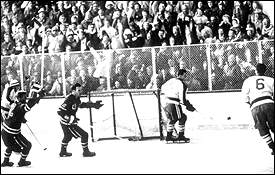 n the break between the second and third periods, the U.S. team got a highly unexpected visit from the captain of the Soviets, Nikolai Sologubov. Aware that the Americans were completely spent, and unable to speak any English, Sologubov mimicked repeatedly with a gesture to his face that after some confusion was eventually interpreted correctly - he thought the team should procure some oxygen. A tank was brought in, and the mask was passed. Revived, the U.S. side returned to the ice and promptly went bubonic, scoring six unanswered goals in the period to walk away with a most unexpected gold medal, an upset miracle at least as amazing as the more famous one that would come twenty years later. As for Sologubov, the motives for his locker room visit were far from pure. A Czech victory would have kept the Soviets out of the medals, while the American victory guaranteed them the bronze.
