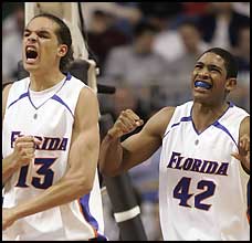 Florida v. Ohio State. If Florida wins, then there's nothing to talk about really, but if Ohio State wins, after the game all the basketball and football players from both sides are going to meet in an epic steel-cage battle royale to decide which school actually rules the year 2007 forever. If it comes down to that, I got money on Ohio State, cause my man Oden looks like he could take out like six motherfuckers without working up a sweat. And the Troy Smith/Chris Leak smackdown? Ninja please. That's like Bobby Lashley against Franchise.