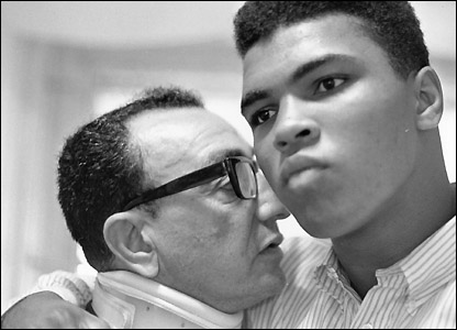 Anyone even remotely connected to the boxing universe knows that Angelo Dundee is one of the nicest guys, if not THE nicest guy, in the business. I met him on the set of Classic Now and approached him meekly just to shake his hand and profess my admiration for his work. He jovially complimented me on my Everlast hoodie and then engaged me in conversation. When I mentioned that I'd recently watched the Clay/Doug Jones fight, he started telling me everything he remembered about the fight, and was about to start in on Leonard/Hearns when his segment was ready to tape. After that, whenever he was on the show I would talk to him, and though he never remembered who I was (and why would he?), he always was as eager to shoot the shit with me as he was the last time we'd met. Once I got his autograph in one of my boxing books, and he signed it, "Dear Dave, thanks for asking," as if the honor was all his.