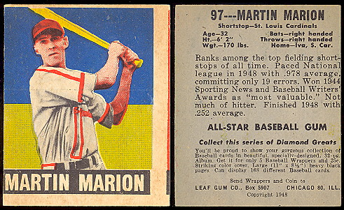 Only one other shortstop remains who won the MVP in the National League, and he's not exactly a household name. In fact, he has to be one of the worst players ever to win the award, which is not to say that he couldn't play, but hell - when they call you the Most Valuable Player after a .267, 63 and 6 season, you just know there's a war on. And so there was in 1944, when the St. Louis Cardinals' SS Marty Marion won the vote over such luminaries as Bill Nicholson, who had a .287, 122 and 33 campaign, and Marion's teammate Stan the Man Musial, who hit .347. Which sort of makes you wonder... exactly how many people did Marty have to blow to get all those MVP votes? Evidently he was a great fielder. But, you know, so was Mark Belanger.