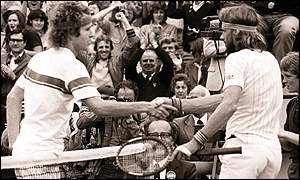 I’ve seen a tape of a semi-exhibition tournament they played in Hilton Head in 1977—watch two minutes of it below (with Pancho commentating; talk about a Goat-fest). I remember Borg, so it was the 30-something Laver who was the revelation for me. I haven’t seen many clips of him, and I was awed by the consistency of his shot-making—he could do anything with the ball—and his high-energy, all-court attack. (Check out that low forehand volley from no-man's land.) You could see that John McEnroe learned a lot from watching his fellow lefty as a kid. On this day, neither Borg nor Laver seemed to have a distinct advantage over the other. Like Federer and Sampras, they were from slightly different eras, but they belonged on the same court.