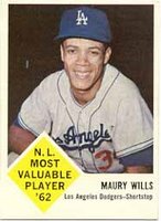 Now for an amazing fact - prior to Larkin, you have to go back 33 years to find another shortstop winning the N.L. MVP, one of the most anomalous MVP awards in baseball history. In 1962, the Dodgers' speedster at short, Maury Wills, stole 104 bases, 72 more than the N.L. base-stealing runner-up that year, his L.A. teammate Willie Davis. It's one of those statistics that just boggles the mind, and it was enough to win him the award (narrowly) over Willie Mays, who put up .304, 141 and 49 numbers that season. You think Matt Holliday is bummed.