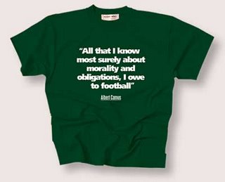 1957 - Albert Camus - Literature As a young man in Algeria, Camus was a great footballer, a goaltender. His days on the pitch, however, were scotched by a bout of TB that he contracted in 1930. I include Camus because of an exchange I once had with an elderly editor at Columbia University Press when I was working there. While discussing Camus, this chap made a remark along the lines of "well, I guess we have tuberculosis to thank for giving us one of the greatest authors of the century." I vividly remember thinking, "yeah, but we also have it to thank for taking away a great footballer, so what's the bloody bleedin difference?" On this score, when once asked which he more preferred, football or the theater, Camus replied, "Football, without hesitation", a quote that I must say I prefer to his far more popular jersey slogan - "All that I know most surely about morality and obligations, I owe to football."